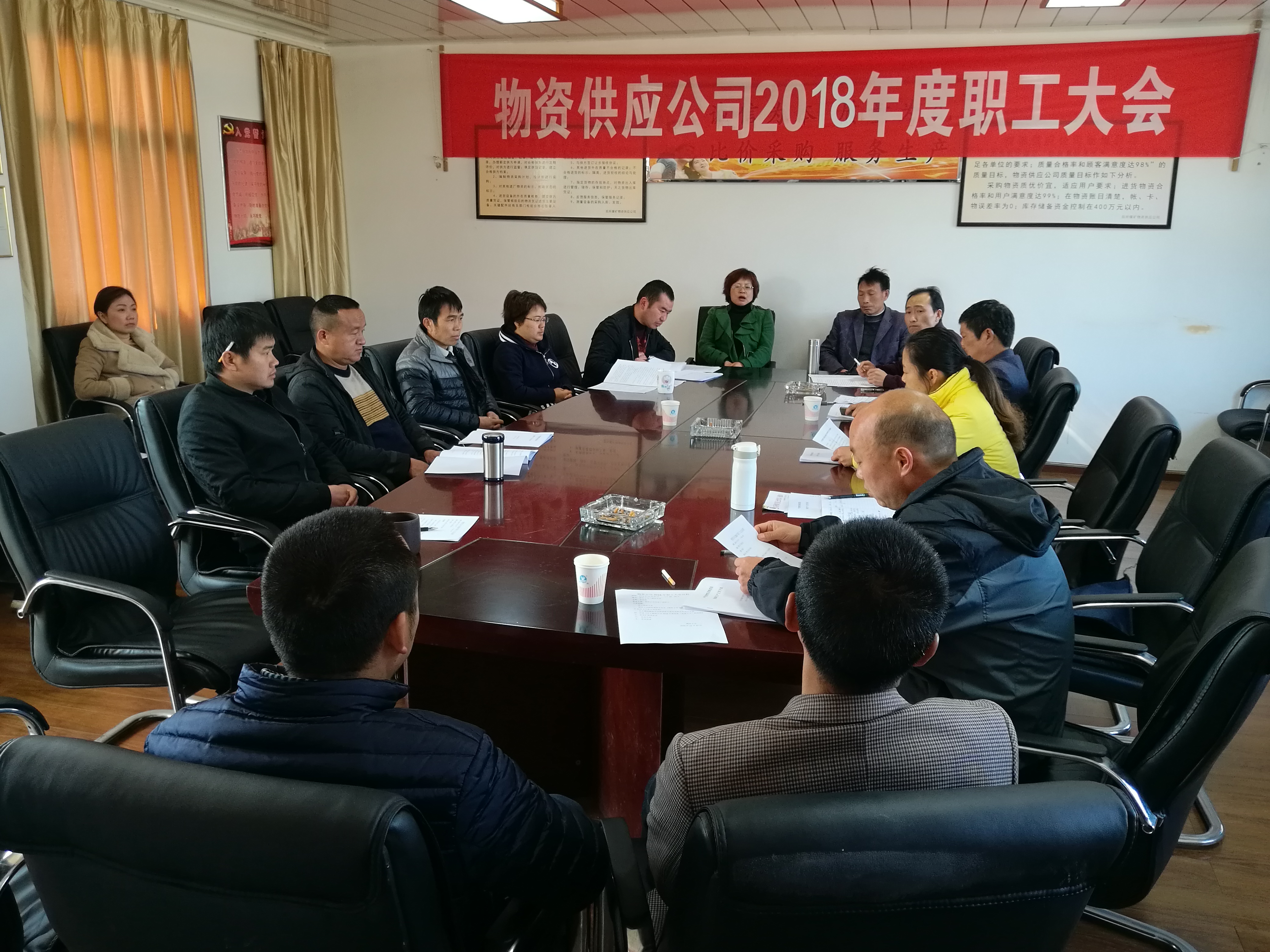物资公司全体干部职工17人于2018年12月27日在公司三楼会议室,召开2019年度职工大会,副矿长胡文考、党政办副主任刘英到会作指导。