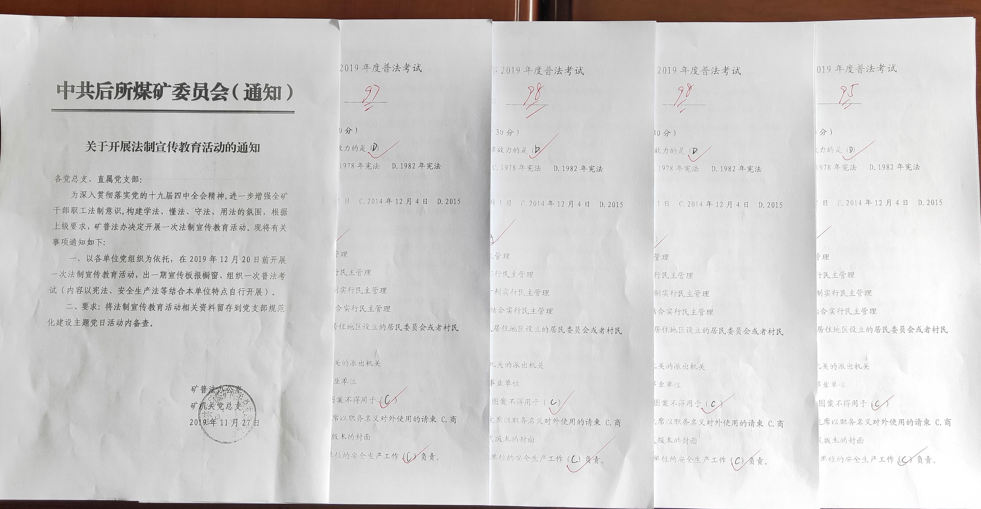 在第六个国家宪法日到来之际,按照矿普法办公室《关于开展法制宣传教育活动的通知》要求,为深入学习贯彻落实党的十九届四中全会精神,充分认识学习宣传宪法的重大意义,推动宪法精神深入人心,进一步增强干部职工法制意识,构建学法、懂法、守法、用法的氛围,维稳信访办公室以《宪法》、《劳动合同法》等法律法规为主要内容,组织维稳信访办公室16名党员、职工开展了2019年度普法考试。(张志明)