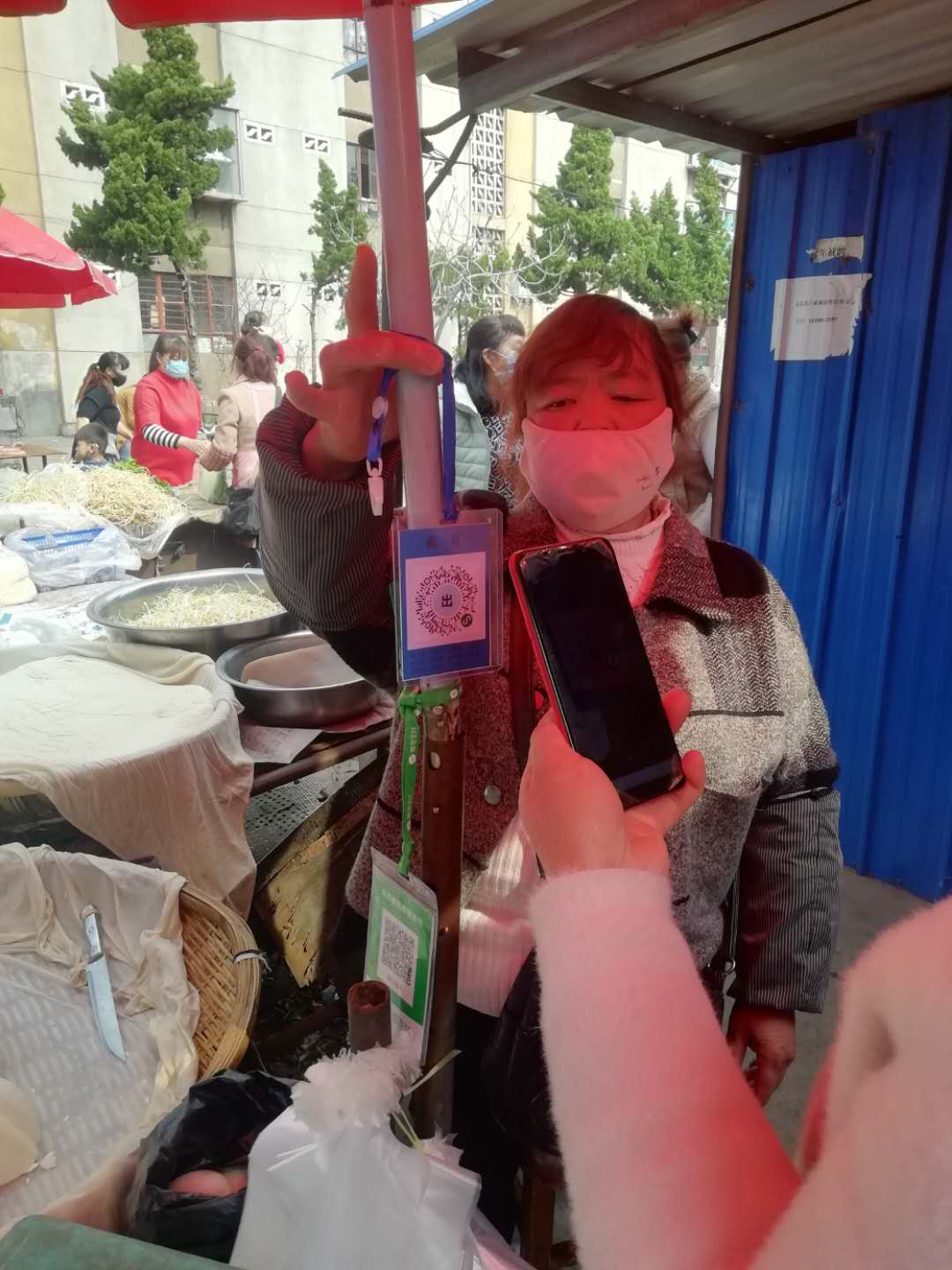 农贸市场是全矿职工家属保障一日三餐的必经之地,矿区大庆小街、煤炭湾小街是传统型集贸市场,商贩们基本都是在路两侧“安营扎寨”,几百米长的街道有很多个出 入口,很难实现封闭式管理。为做好疫情防控,后勤党支部与社区党总支、街道派出所形成联动,注册“云南抗疫情”小程序,生成二维码,把印有“到达”、“离开”字样的二维码制作成胸挂牌发放给每一位商贩,要求商贩按“先测体温后摆摊,摆摊之前挂胸牌,摊位之间距3米,交易扫码速离开”的程序和要求开展经营。凡是到本摊点购买商品的客户必须先扫“到达”的二维码,交易完成后扫“离开”二维码,这种“以静制动”、“管点控面”措施,既落实了防止疫情传播蔓延的工作要求,又全力保障群众生活所需,维护社会安全稳定。