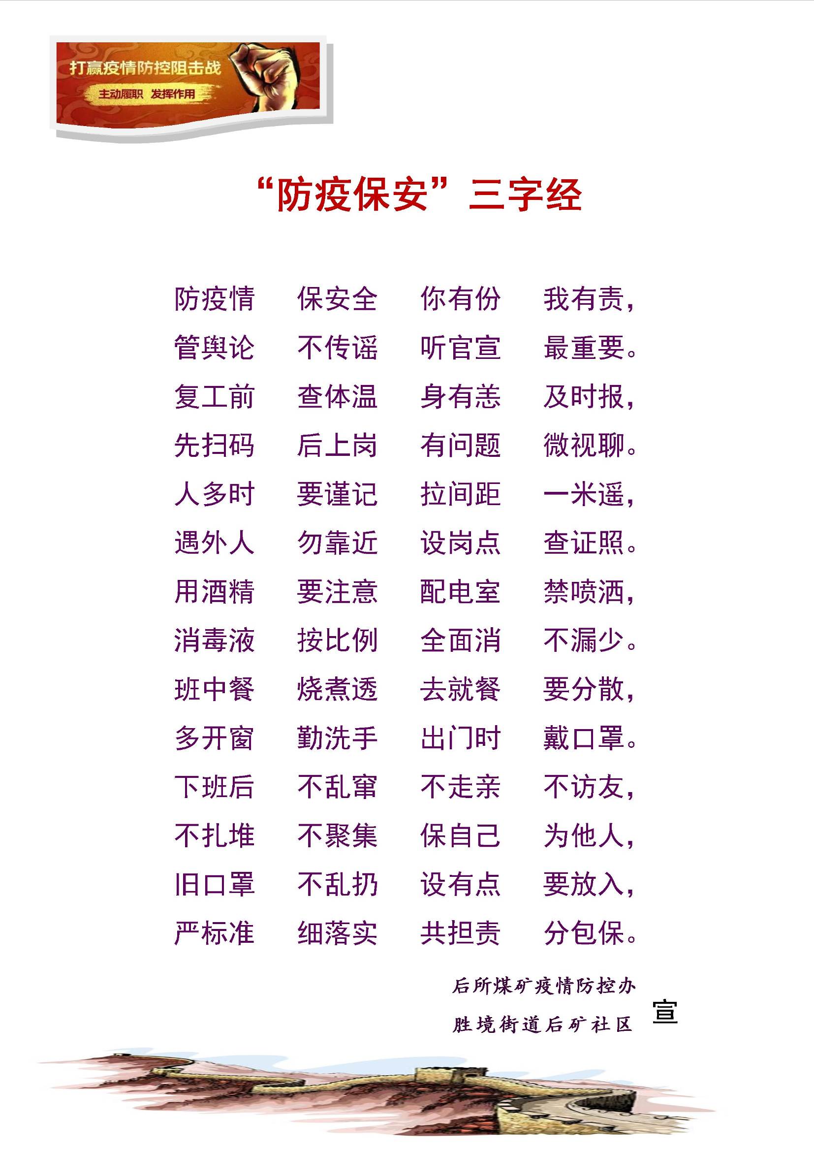 “防疫情,保安全,你有份,我有责,管舆论,不传谣,听官宣,最重要……”面对复杂严峻的疫情防控形势,如何让职工家属读了“顺心”,听了“上心”,防起来“用心”,矿防疫办把防疫知识与职工安全作业知识相结合,以喜闻乐听的方式,编制的“防疫保安三字经”注1,简洁、诙谐,读起来朗朗上口,在电子大屏、黑板报和广播循环播出。全方位、多角度开展疫情防控宣传,激起职工家属防控疫情的积极性和主动性,掌握防控措施,冷静、正确看待疫情,为坚决打赢疫情防控战、为复工攻坚战提供有力舆论支持。