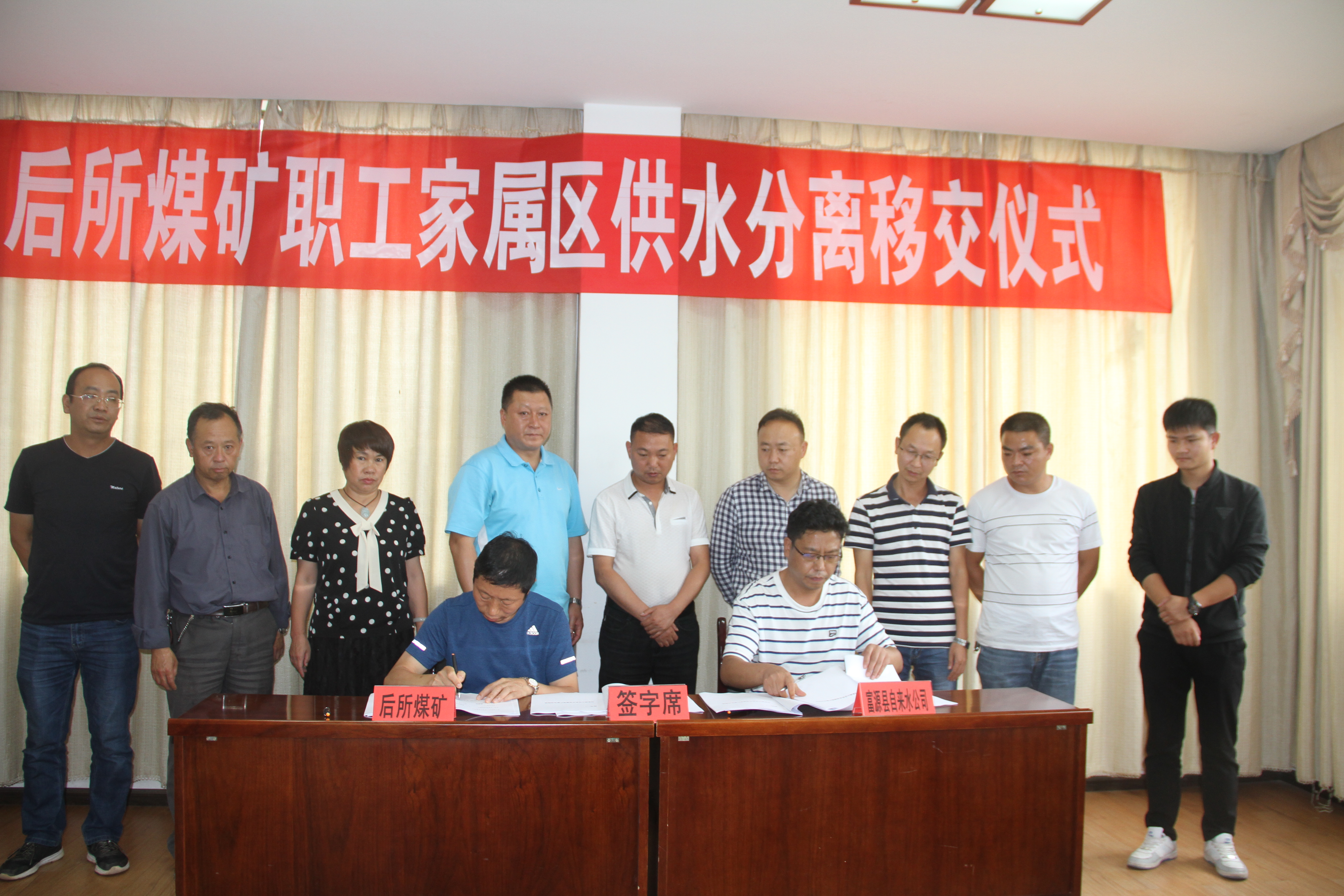 后所煤矿党委书记王学文7月15日与富源县自来水公司经理李飞签订供水移交协议、7月13日后所煤矿党委副书记、工会主席谭其银与富源县财政局书记李德彦签订物业移交协议。