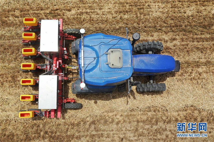 在河南省邓州市小杨营镇安众村,加装有北斗导航系统的拖拉机在无人驾驶状态下播种(2020年5月26日摄,无人机照片)。新华社记者 冯大鹏 摄