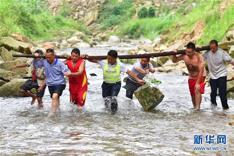 在位于黔桂交界大苗山深处的乌英苗寨,驻村第一书记韦桂华(右四)、党员梁成兵(右三)、梁志新(左二)带领村民维修河堤(2019年6月30日摄)。新华社记者 黄孝邦 摄