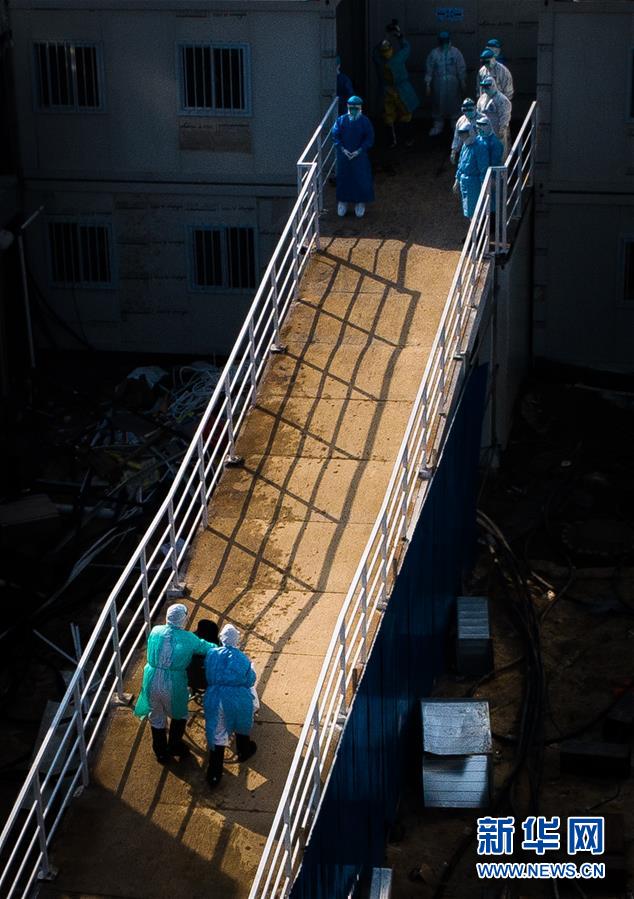 医护人员将患者送入武汉火神山医院病房(2020年2月4日摄,无人机照片)。 新华社记者 肖艺九摄