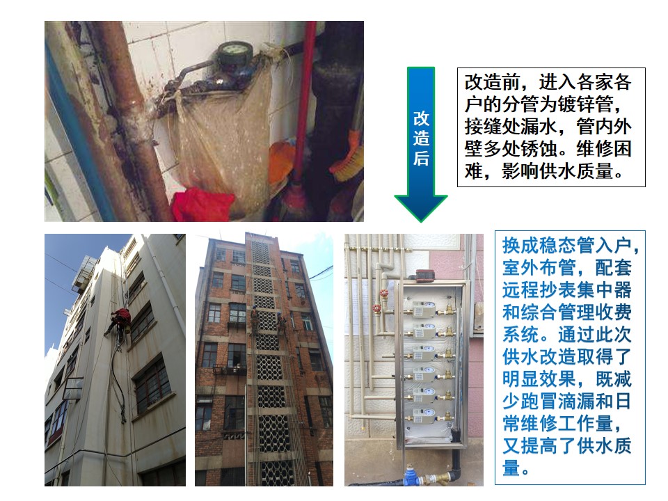 “三供一业”供水分离移交改造是党和国家利企惠民的好政策,其政策性和专业性较强、涉及面广、操作异常复杂。按国家居民生活用水安全新标准和新要求,本次改造重点放在各片区供水主管、各楼栋给水支管及入户分管的更换和煤碳湾水处理厂管路设备大修等方面。通过改造,取缔了各楼栋房顶水箱,采取变频恒压直供水,实现集中表箱远程抄表,广大住户对改造后的水压、水质较为满意。