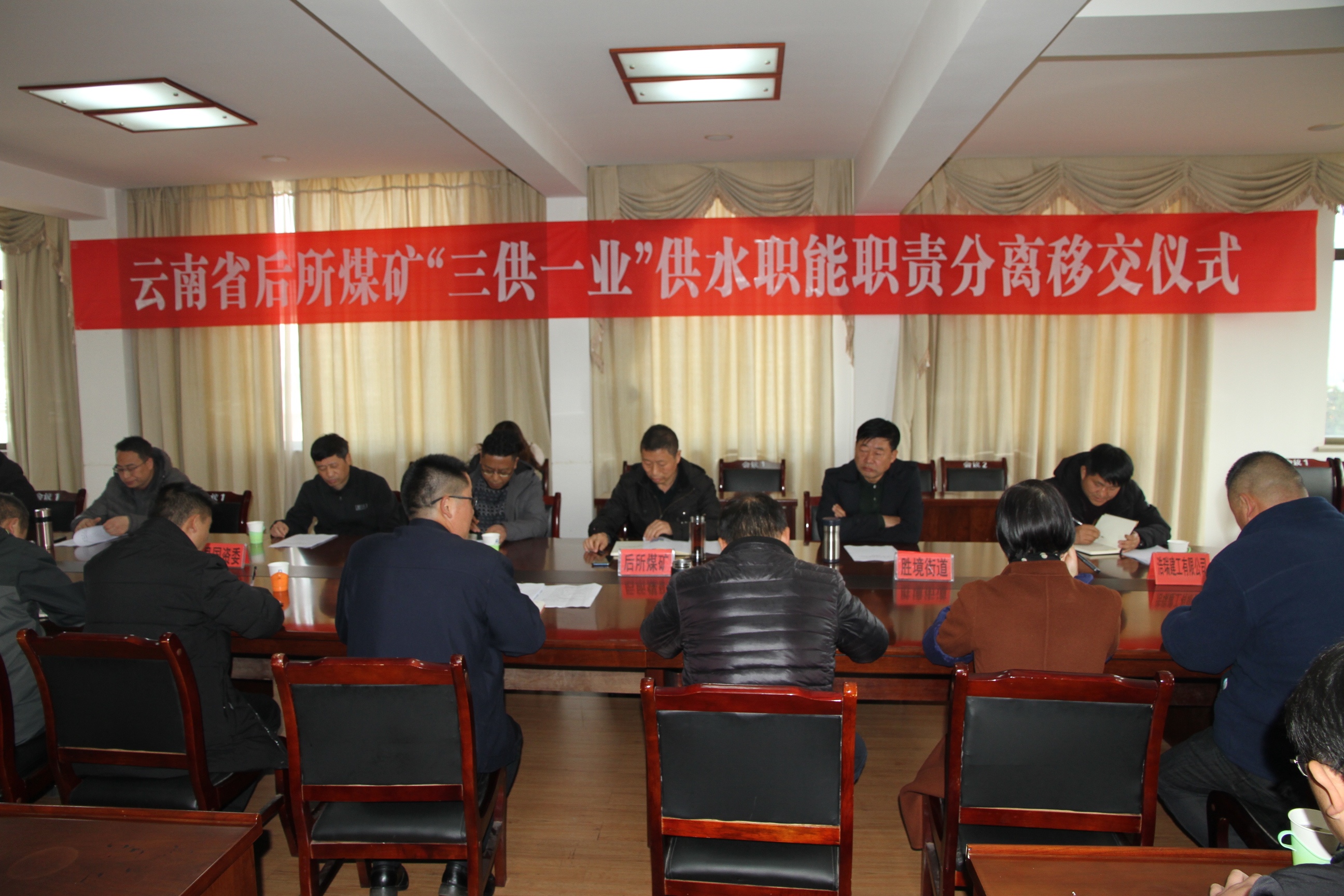 移交仪式上,谭其银向参会人员报告矿区供水管网分布情况,介绍矿区“三供一业”供水改造的基本项目和内容。交接双方在确认分离移交条款的基础上,共同签订了《云南省后所煤矿“三供一业”供水职能职责分离移交协议》、《城市供水合同》,交接了矿区用水住户清册表和资产清单。双方企业代表分别作表态发言。县自来水有限责任公司总经理李飞表示,公司将加强供水保障,完善新的管理机制,推行供水的标准化和网格化,努力为矿区职工家属提供高效,优质的供水服务,并希望与矿上建立良好的长期合作关系,共同为企业发展做出贡献。