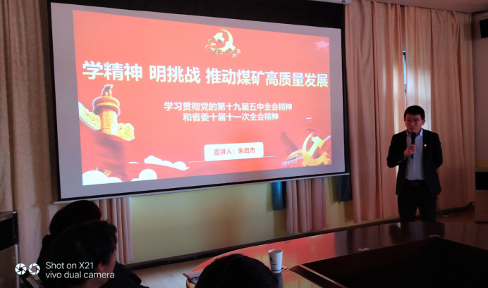 为认真贯彻落实中央关于抓好党的十九届五中全会精神宣传宣讲和省委关于抓好省委十届十一次全会精神学习宣传工作要求,2月3日下午,“省国资委党委青年宣讲团”成员朱启杰在兴云矿井党总支部开展专题宣讲活动。兴云矿井领导班子、各科室和连队主要负责人、工程技术人员、青年团员等50人参加了宣讲会。