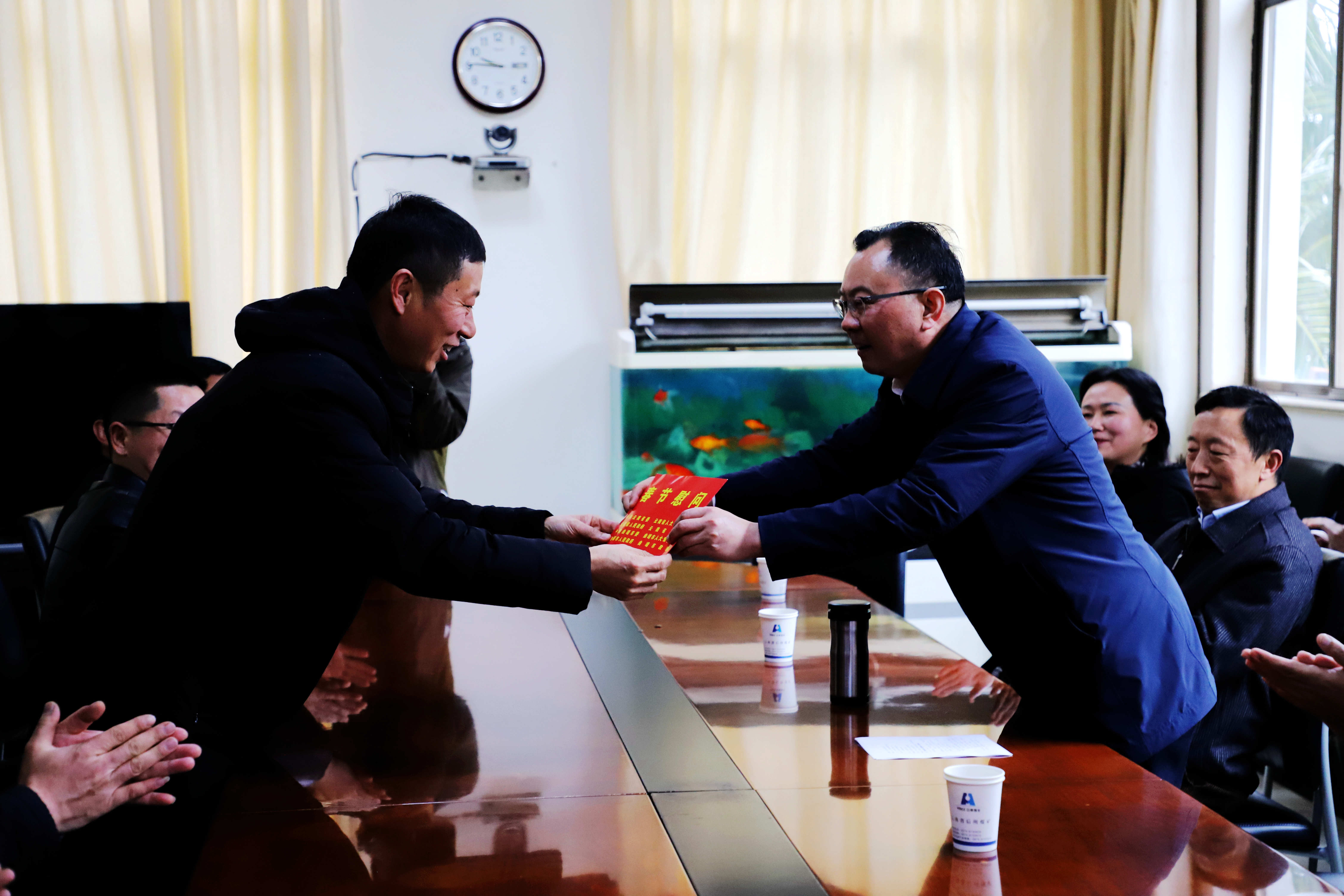 上午10时, 在矿调度会议室, 党委书记王学文同志向慰问团的领导简要汇报了后所煤矿近年来安全生产经营工作情况。 慰问团的各位领导一边听 、一边详细询问了解企业的安全、经济效益、职工收入等情况。 市委常委、市委宣传部部长唐开荣听完汇报会后,高兴地说:“ 后所煤矿是云南煤炭行业内的老牌企业 , 多年来,企业为地方经济发展和劳动就业、社会稳定方面发挥了很大的作用,作出极大贡献, 各项工作搞得比较好, 希望企业勇于面对市场挑战, 团结一心,扎实工作,为富源县的经济发展作出新的更大的贡献 ” 。新春佳节即将来临, 唐开荣同志代表市委、市政府祝全矿职工家属工作顺利、身体健康、合家幸福 , 新春快乐!