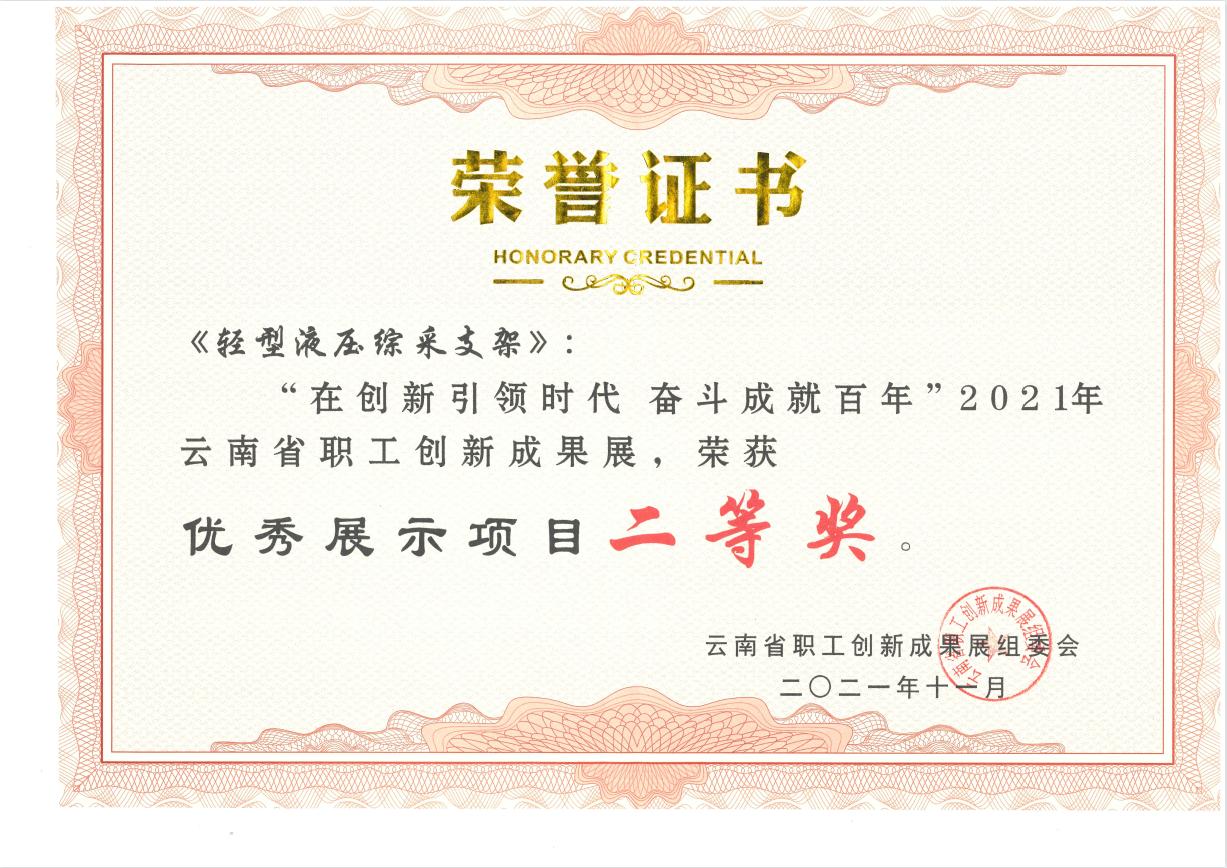 近日,由云南省职工经济技术创新工程领导小组主办,云南省总工会承办,云南省科学技术协会协办的一次以“创新引领时代、奋斗成就百年”为主题的职工创新成果展评选结果揭晓,后所煤矿有限公司参展的“轻型液压综采支架”技术创新成果荣获优秀展示项目二等奖。