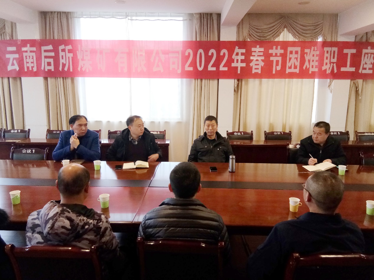 2022年1月27日,云南后所煤矿有限公司召开2022年春节困难职工座谈会。座谈会分两片区举行,在公司四楼会议室召开刘家湾片区困难职工座谈会,之后在兴云煤矿召开兴云片区困难职工座谈会。公司党委书记、董事长王学文,总经理王自宏、纪委书记庄廷飞、工会副主席乔向宇以及困难职工所在单位党组织书记、工会主席参加会议。座谈会由公司党委副书记、工会主席杨昌松主持。