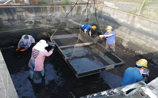 今年以来第一次对该沉淀池进行清理,工作量比较大,大家做好了充足的准备,按照既定的方案开展清淤工作。活动中为了加快进度,采用装载机配合人工作业的方式进行,由于淤泥比较稀,只能用橡胶桶一桶一桶地打捞至收集容器中,再由装载机提升至池外集中摆放、晾晒,重复作业。在烈日的照身下,渐渐地汗水湿透了衣背,手上磨出了一道道红印,脸上和班衣处处都粘上了泥浆,但大家始终保持不怕苦、不怕累、不怕脏的工作精神,经过4个小时的努力工作,污水沉淀池淤泥清理工作顺利完成,保证了沉淀池容积达到要求,为做好“雨季三防”及环境保护工作做出积极贡献。(市场营销部 张敏)