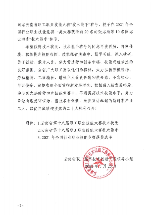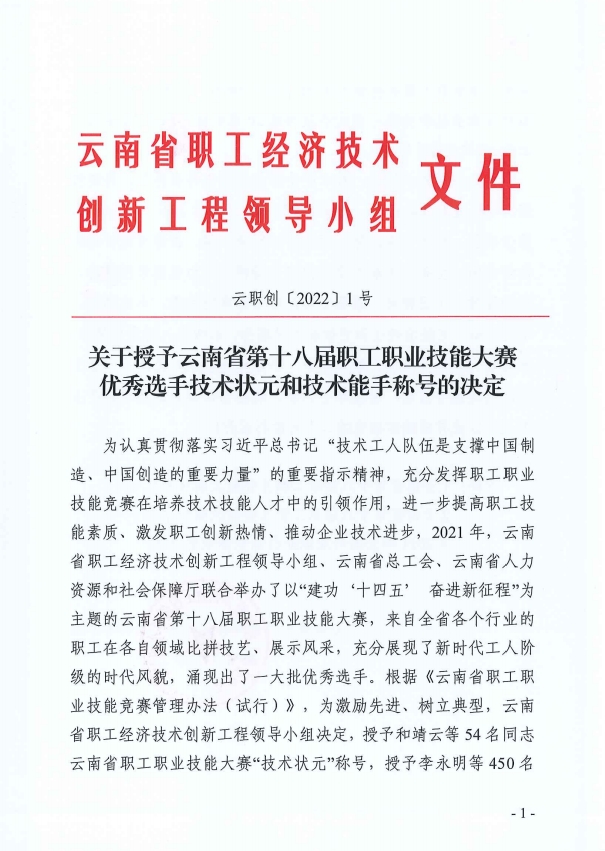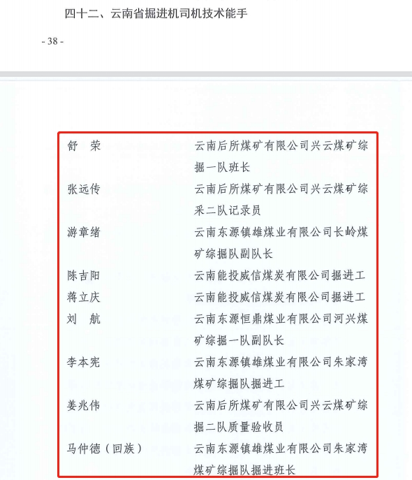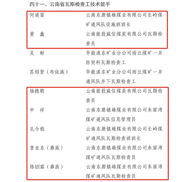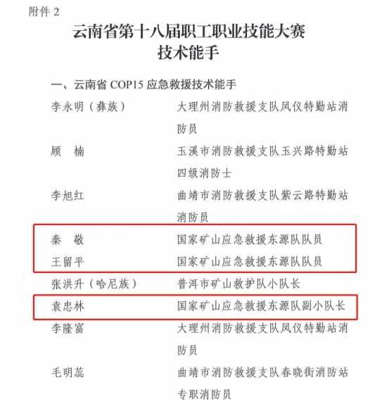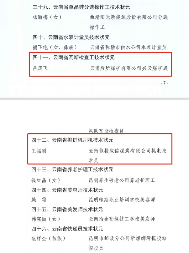 近日,云南省职工经济技术创新工程领导小组印发《关于授予云南省第十八届职工职业技能大赛优秀选手技术状元和技术能手称号的决定》,集团所属云南后所煤矿有限公司兴云煤矿通风队瓦斯检查员吕茂飞荣获 “云南省瓦斯检查工技术状元”称号,云南能投威信煤炭有限公司机电技术员王福刚荣获“云南省掘进机司机技术状元”称号。集团一线技术职工何道富、黄鑫、杨德朝、申祥、孔令稳、普亚东、陈炤霖7人荣获“云南省瓦斯检查工技术能手”称号,舒荣、张远传、游章绪、陈吉阳、蒋立庆、刘航、李本宪、姜兆伟、马仲德9人荣获“云南省掘进机司机技术能手”称号,秦敬、王留平、袁忠林3人荣获“云南省COP15应急救援技术能手”称号。