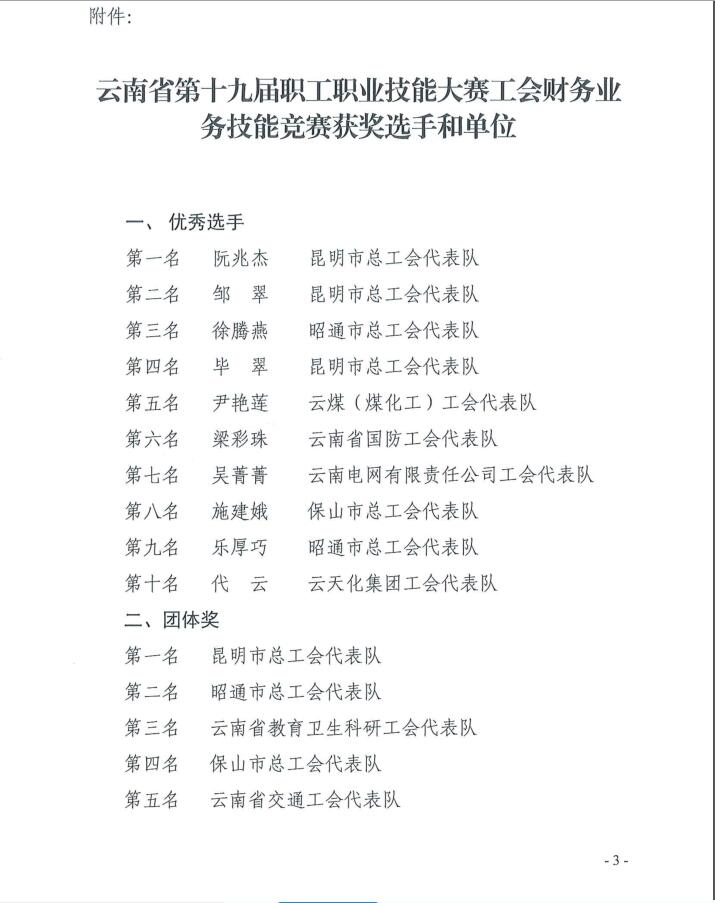 近日,后所煤矿有限公司尹艳莲和陶秀梅代表云煤集团参加云南省第十九届职工职业技能大赛工会财务业务技能竞赛,经过激烈角逐,尹艳莲荣获个人第五名,云煤(煤化工)工会代表队获团体优胜奖。尹艳莲在省级大赛中崭露头角,并喜获佳绩,实属不易。省总号召全省工会财务人员以获奖个人和单位为榜样,立足本职、爱岗敬业,珍惜荣誉、再创佳绩。(公司工会 魏成旺)