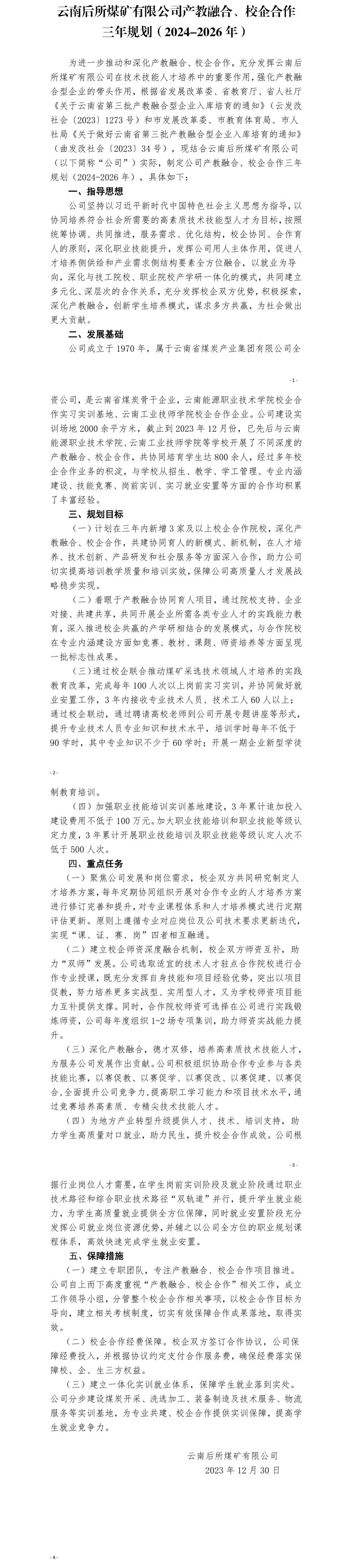 云南后所煤矿有限公司产教融合、校企合作 三年规划(2024-2026年)