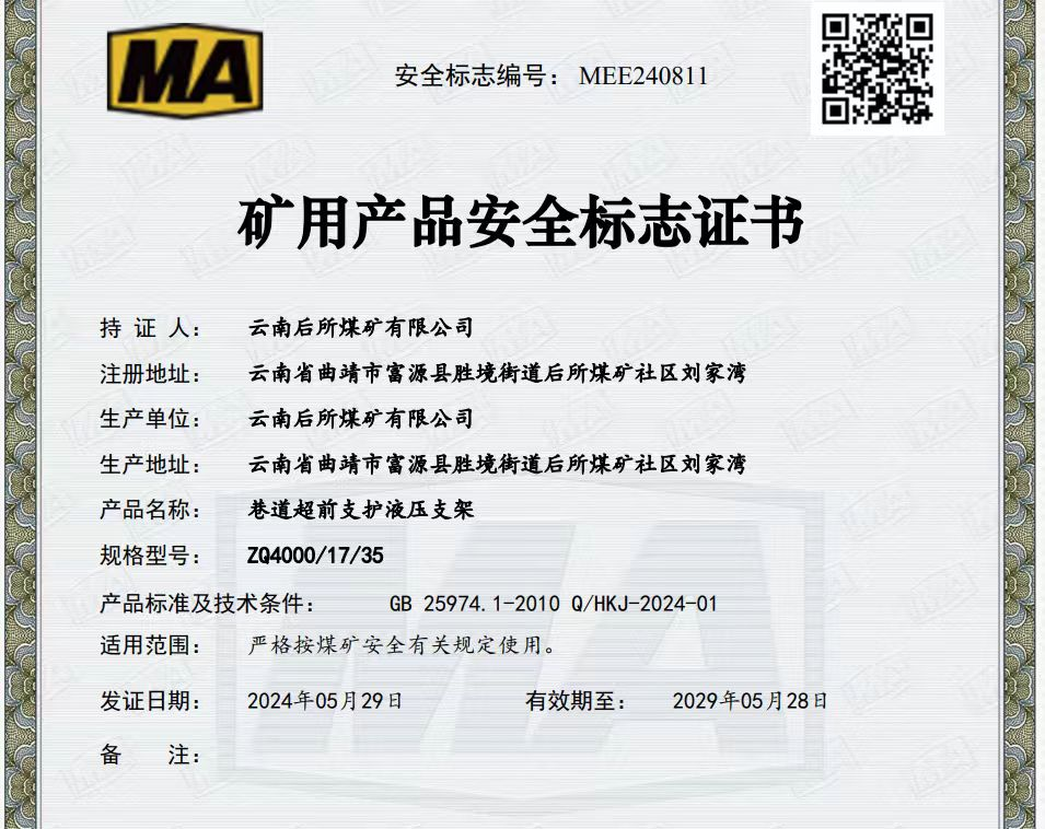 此次安标证书的获得,不仅是对ZQ4000-17-35型巷道超前支护液压支架安全性能与技术实力的权威认证,更是对后所煤矿公司在煤矿安全支护领域持续创新、追求卓越精神的最佳诠释。它不仅增强了产品在市场上的竞争力与公信力,更为赢得客户的广泛信赖与好评,为市场拓展与品牌影响力提升奠定了坚实的基础。