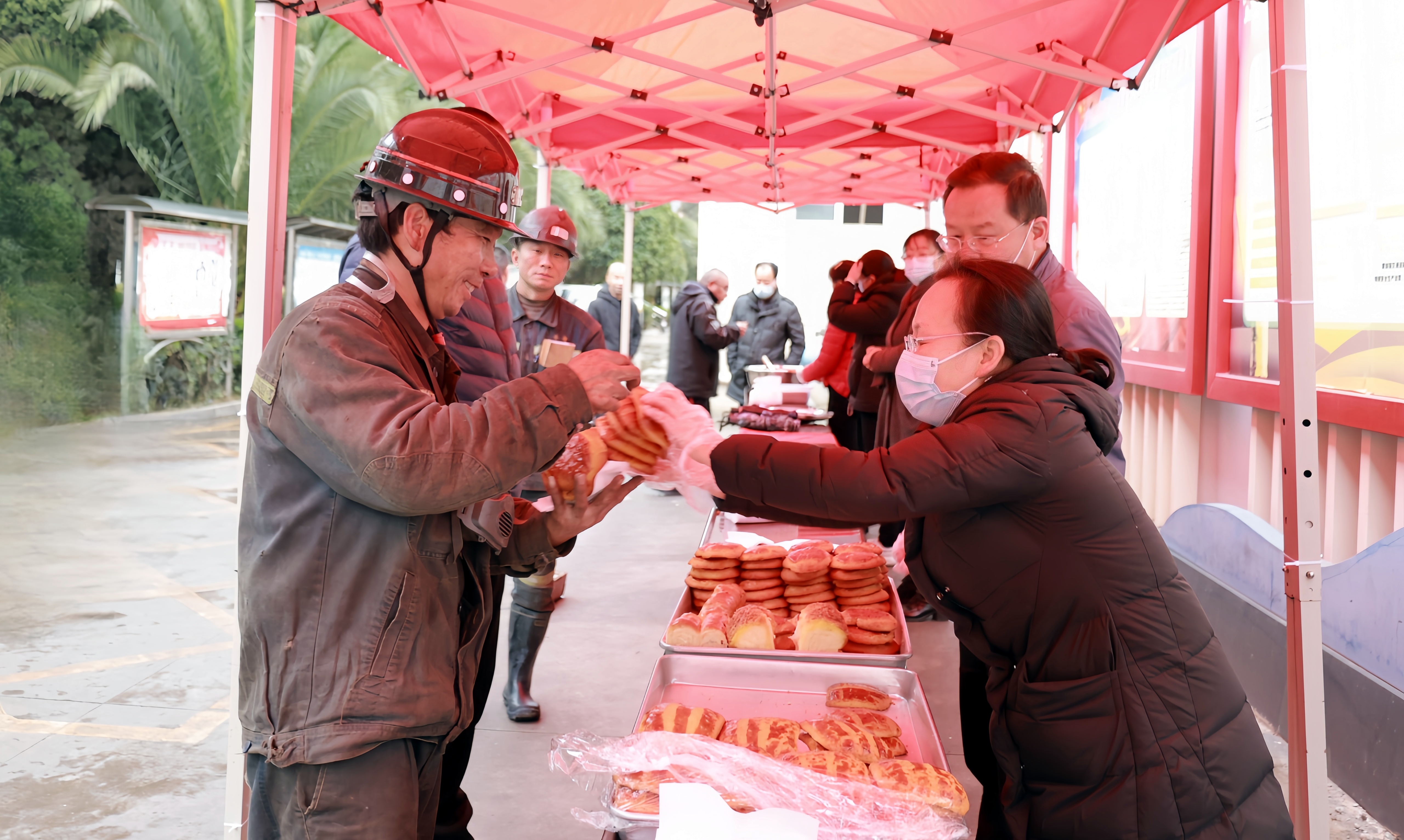 活动现场,女职工代表们个个热情洋溢,脸上挂着温暖的笑容。她们早早便来到井口,手中捧着精心准备的爱心餐点:冒着腾腾热气的红糖鸡蛋,象征着传统滋补与健康祝福;新鲜出炉的面包、香脆可口的饼干,还有各式各样造型精致的糕点,每一份都承载着甜蜜与关怀。这些美食不仅是物质上的补给,更是精神上的慰藉,为矿工兄弟们的辛勤劳作增添一份幸福的滋味。