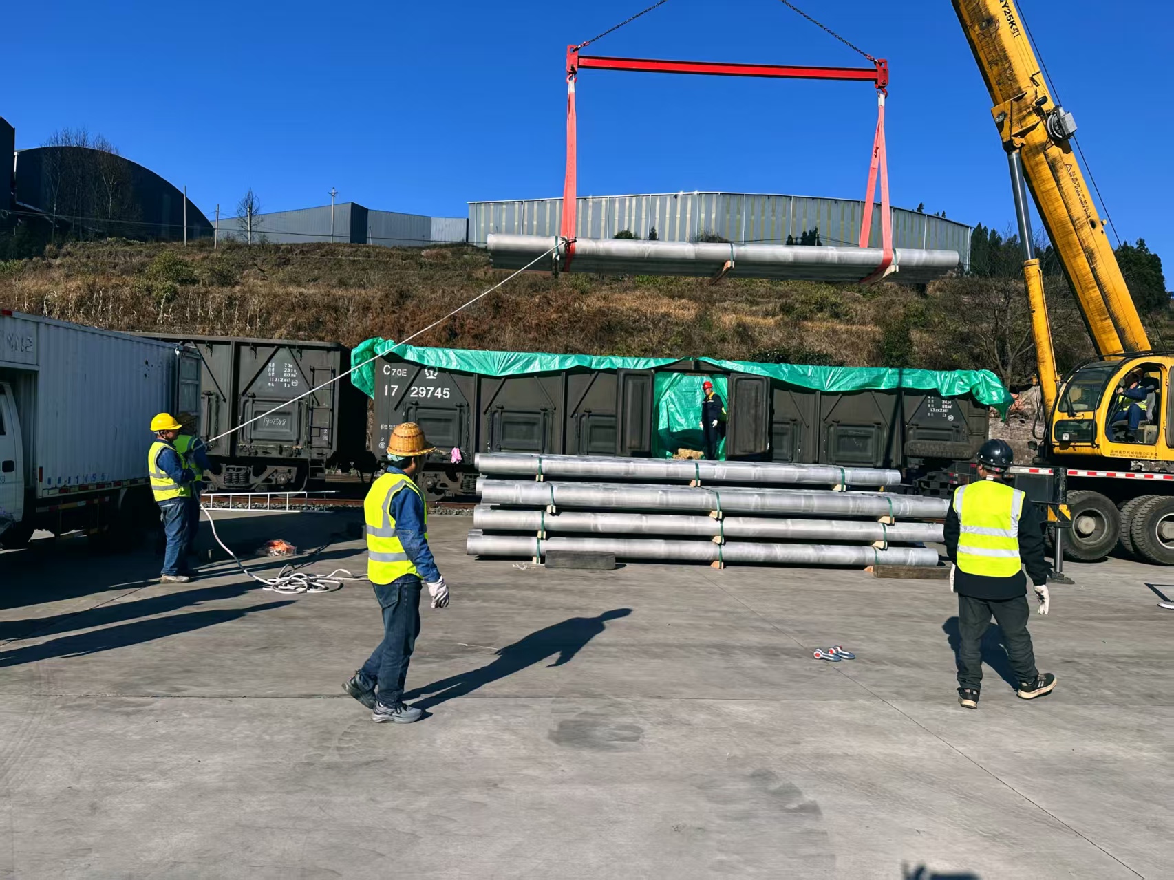 针对铝圆棒表面光滑、直接用吊带起吊易滑动且效率偏低的问题,物流公司立足现有条件开展小改小革,制作加装防滑装置的吊架,有效破解作业难题。作业过程中,现场实行专人统一指挥,各岗位严格遵循“试吊—起升—落位”标准化流程,精准控制吊点、调整平衡,杜绝铝棒晃动碰撞;各环节协同配合、规范操作,最终实现作业零失误、零隐患,大幅提升单次吊运效率。