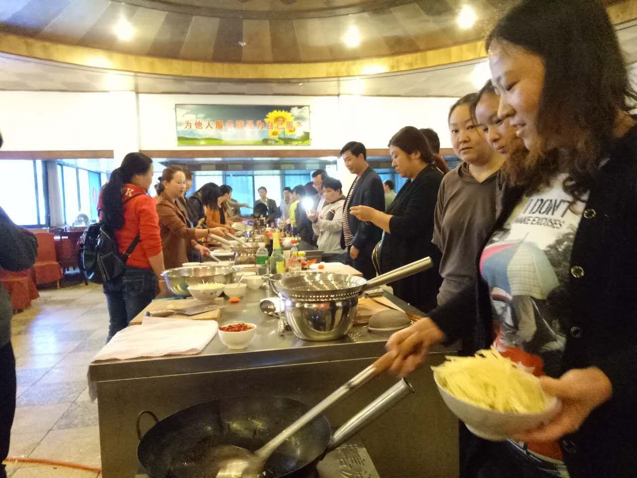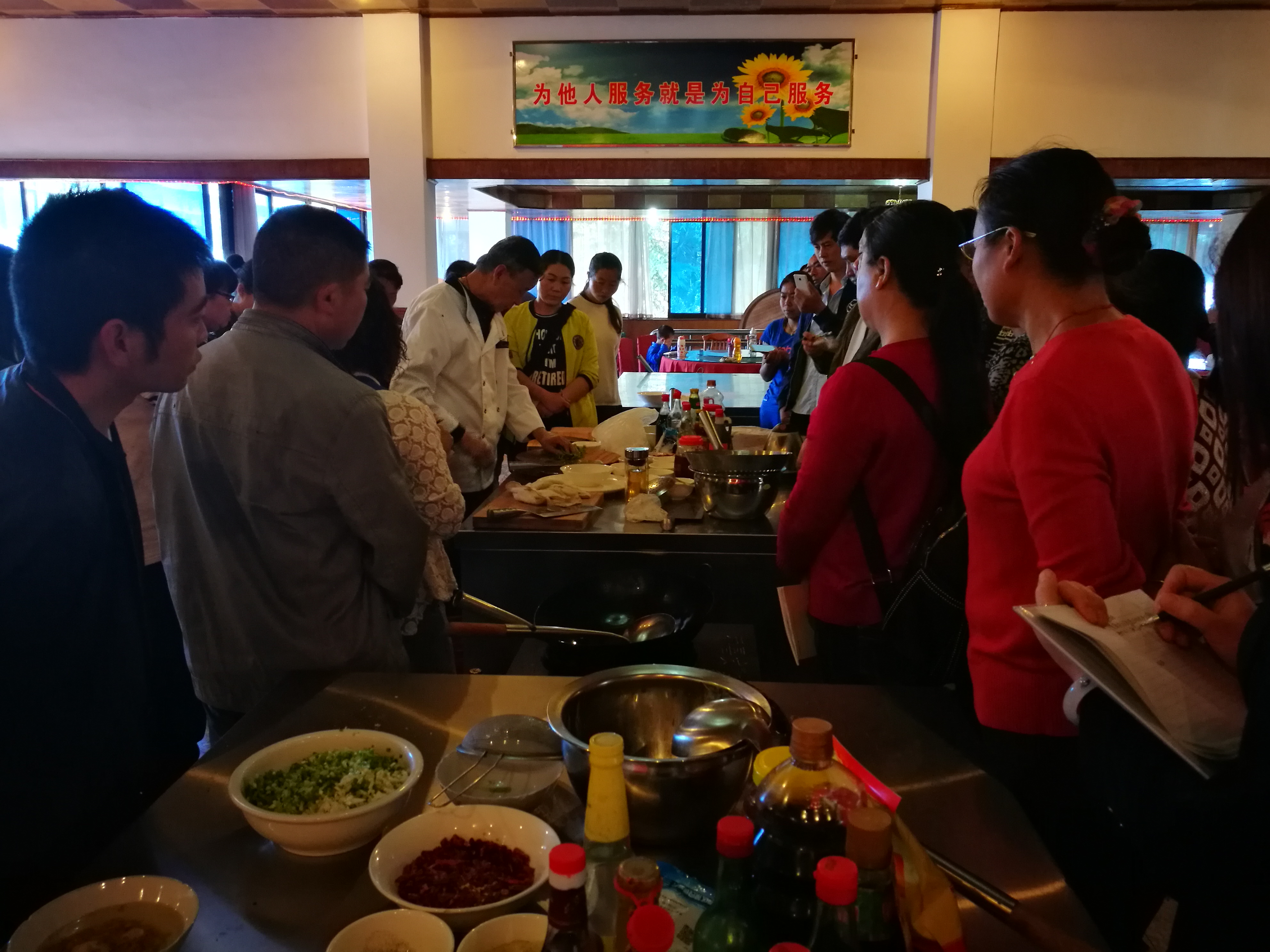 叶老师上完实践课,就让学员们自己动手操作一番,经过一阵推让,几位学员就作为代表上前进行表演。小荣是第一个上去操练的,他的整个动作过程显得较为老练,尤其在颠锅的时候,熟练的动作引得了学员们的阵阵掌声,叶老师也笑眯眯的夸奖了他。很快一大桌菜就炒好了,大家拿出食堂准备好的碗筷,互相点评着彼此的手艺。