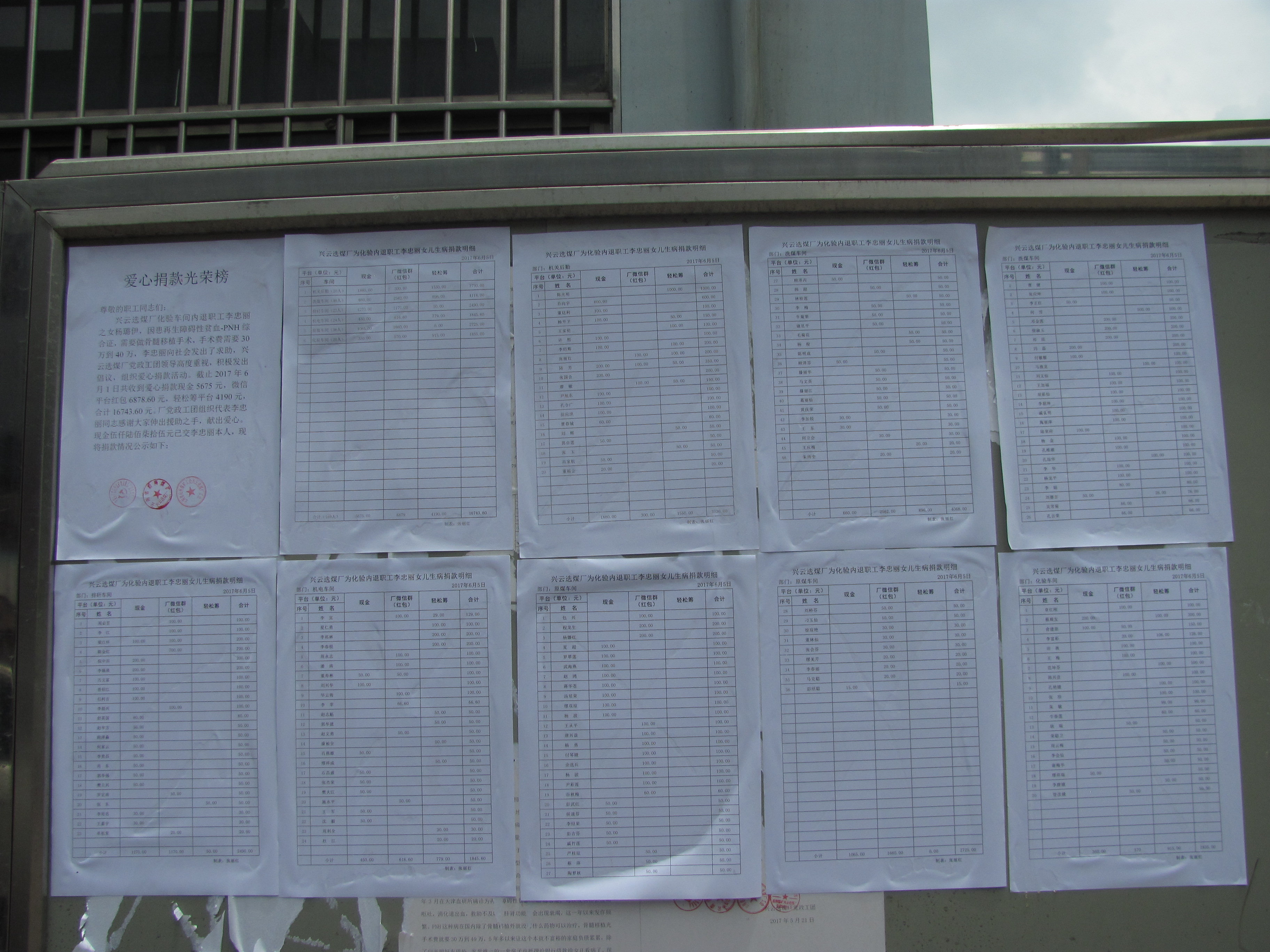 兴云选煤厂化验车间内退职工李忠丽之女杨璐伊,因患再生障碍性贫血-PNH综合症,6年间,为给女儿治病,已债台高筑,现光靠杨洪文2600元左右的工资和李忠丽1180元的内退工资,治疗日常的并发症都入不敷出,此种病在国内除了骨髓移植,没有任何药物可以治疗,做骨髓移植手术费需要30~40万元,2017月5月17日李忠丽向社会发出了求助,兴云选煤厂党、政、工、团领导得知消息后高度重视,积极发出倡仪,组织爱心捐款活动。截止募捐结束日期之时,共收到爱心捐款现金5675元,兴云选煤厂厂微信群平台红包6878.60元,轻松筹平台4190元,合计16743(壹万陆仟柒佰肆拾叁)元,现所有善款已交付李忠丽。(兴云选煤厂 陆芳)