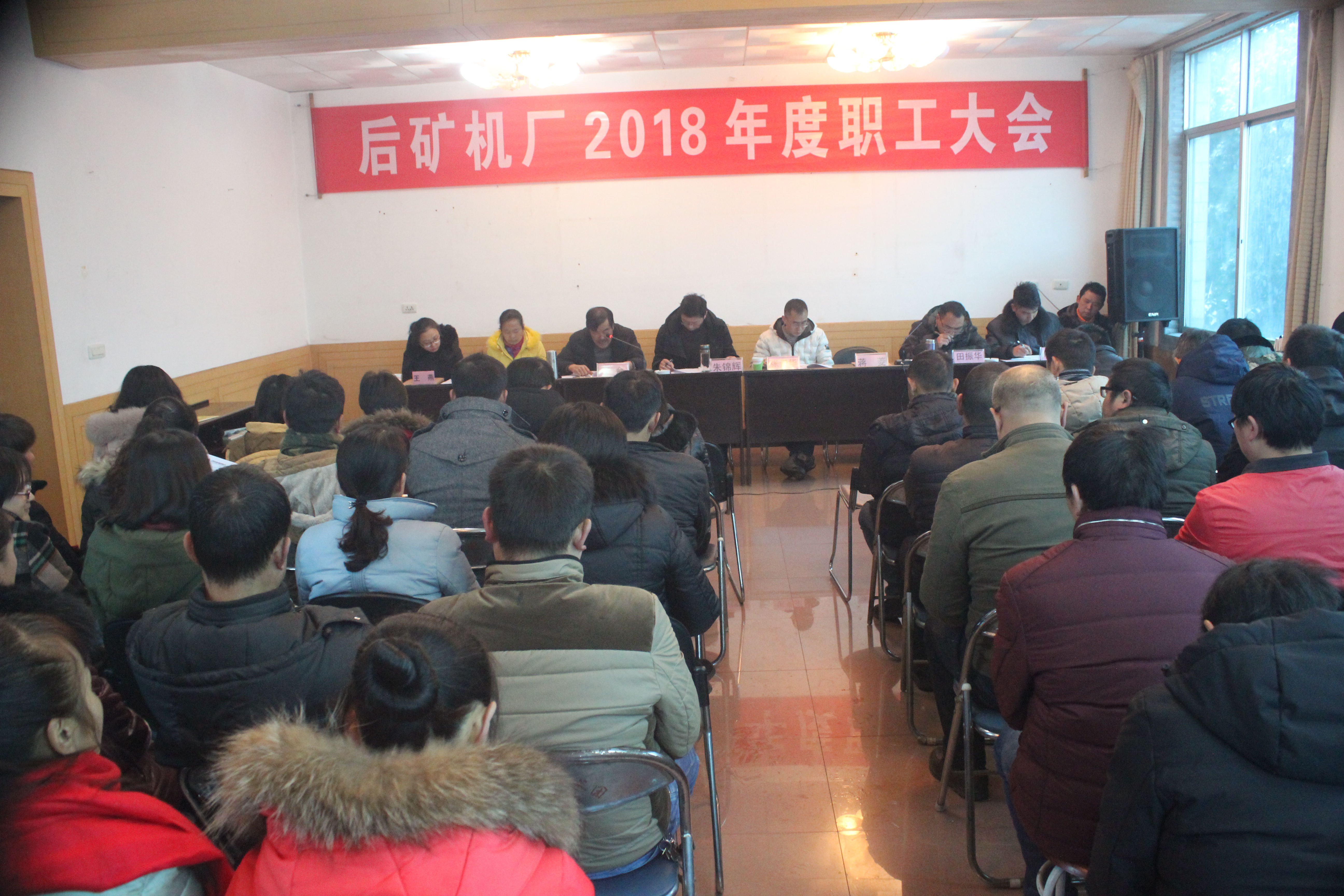 12 月30日,机厂在二楼会议室组织全体职工召开了2018年度职工大会,后所煤矿副矿长朱锦辉、张贵华,党政办副主任刘英及相关部门工作人员参加了会议,会议由副厂长田振华主持。
