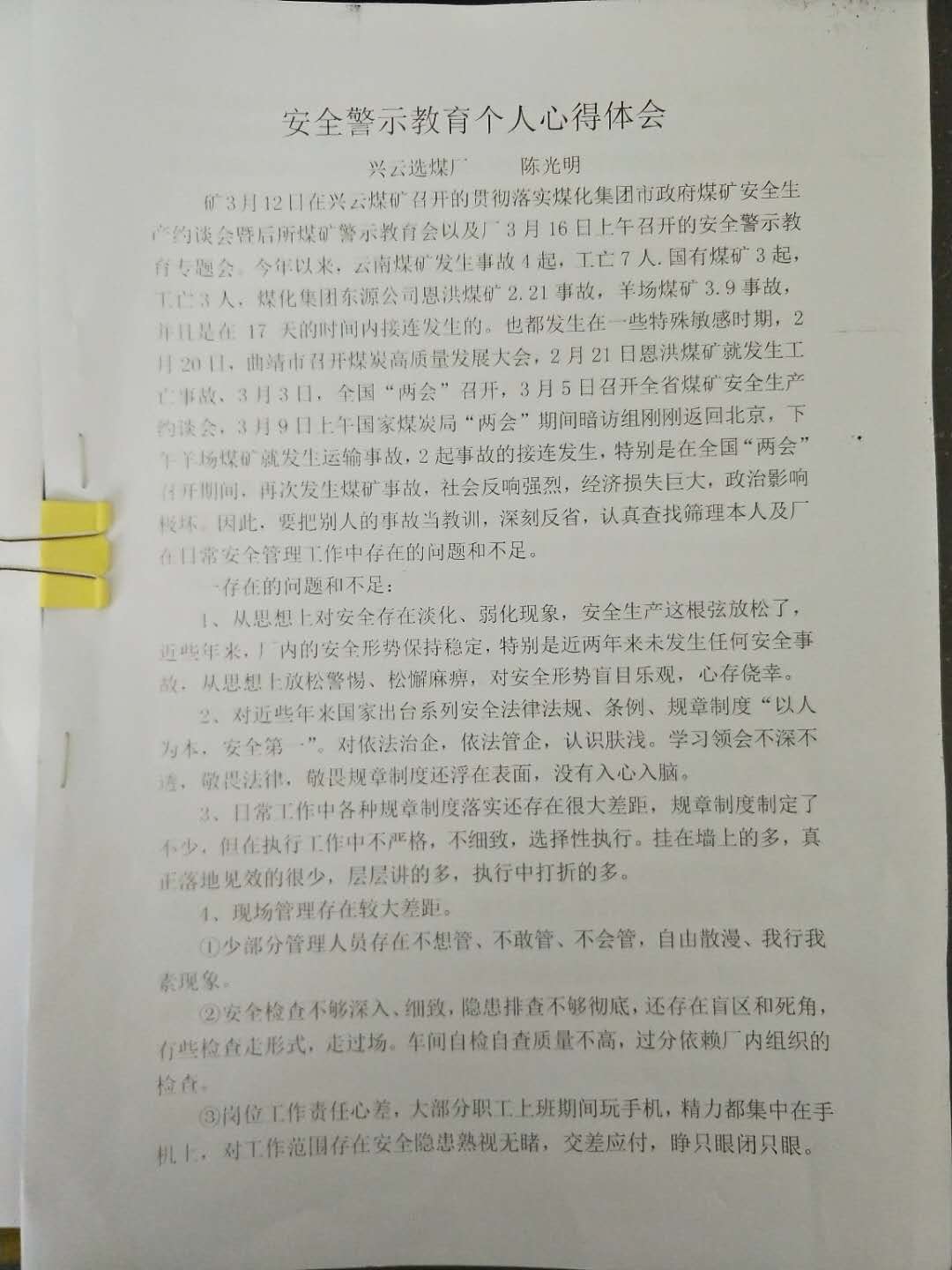 3月16日在厂召开安全警示教育大会后,兴云选煤厂为进一步让全厂职工深刻领会会议精神,实现厂的 本质安全,杜绝事故的发生,继续推进全厂的安全警示教育工作。
