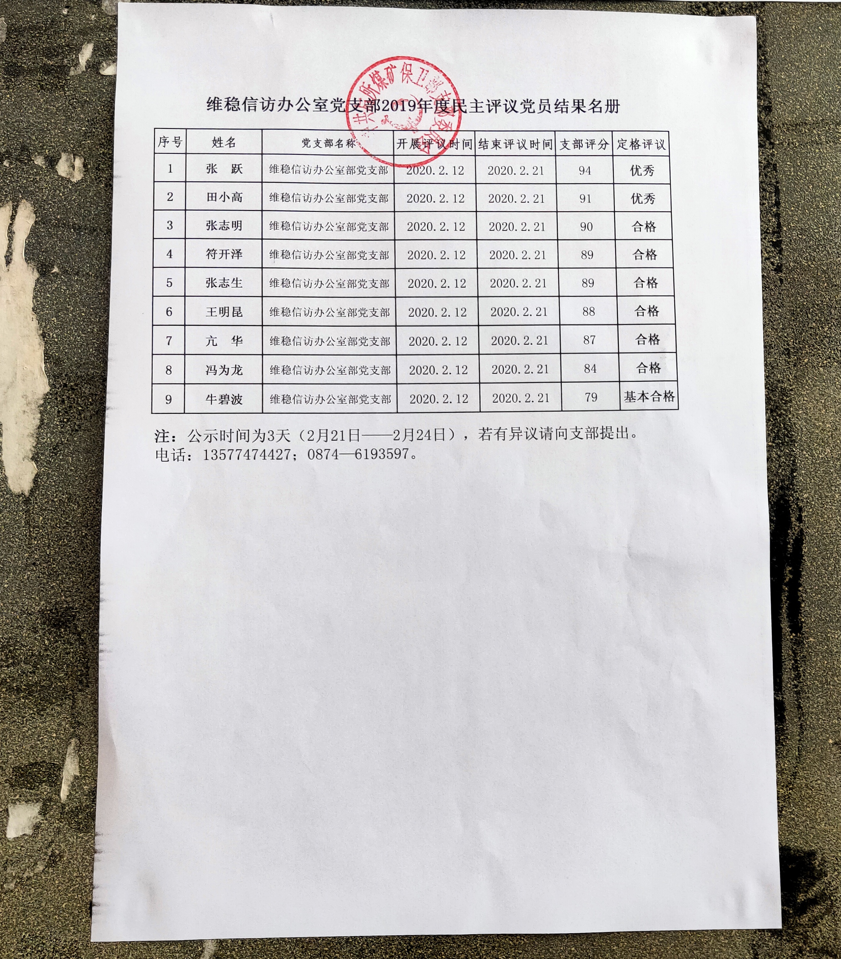 2月12日至21日9名党员分别填写了《2019年度民主评议党员登记表》,根据提高素养、增强党性党风党纪的要求,对照党员权利义务的规定,以党员“五带头”和“四优”为目标,认真总结一年来发挥党员先锋模范作用和践诺情况,撰写了党性分析材料,开展批评与自我批评,按照《民主评议党员目标评价考核细则》进行了自评打分,同时在《维稳信访办公室支部委员会2019年度民主评议党员互评打分表》对其他8名同志实事求是地进行了互评打分并提出意见或建议。