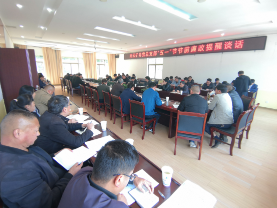 五一”国际劳动节将至,为深入贯彻落实中央八项规定及习近平总书记反腐倡廉重要讲话精神,切实防止“四风”问题,持续加强作风建设,确保矿井干部职工度过一个轻松、愉快、勤俭、清廉的节日。兴云矿井党总支于4月27日下午在机关中会议室召开节前廉政提醒谈话会,矿井党政班子成员、机关组室干部、连队党政主要领导及部分特岗人员和技术员43人参会。