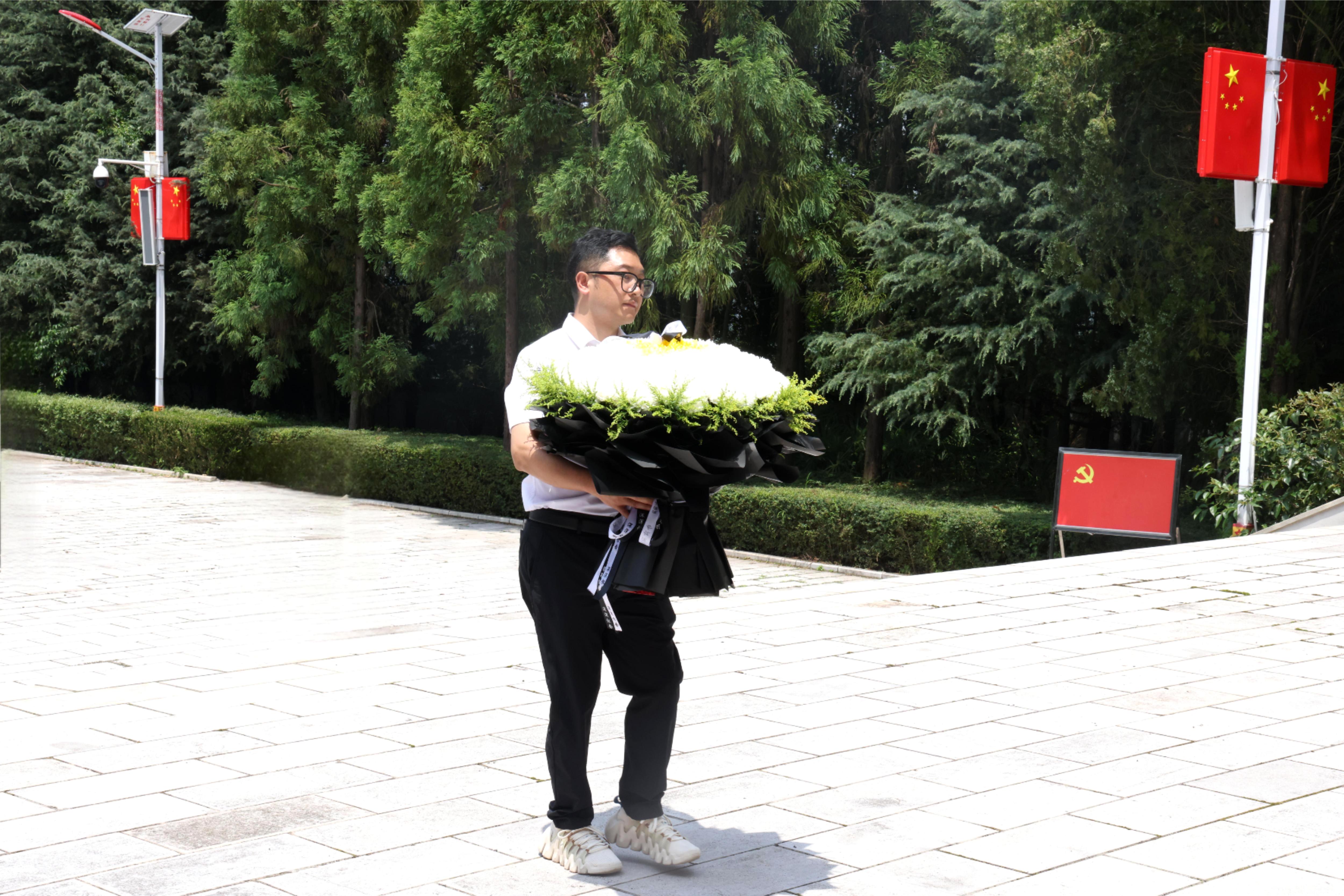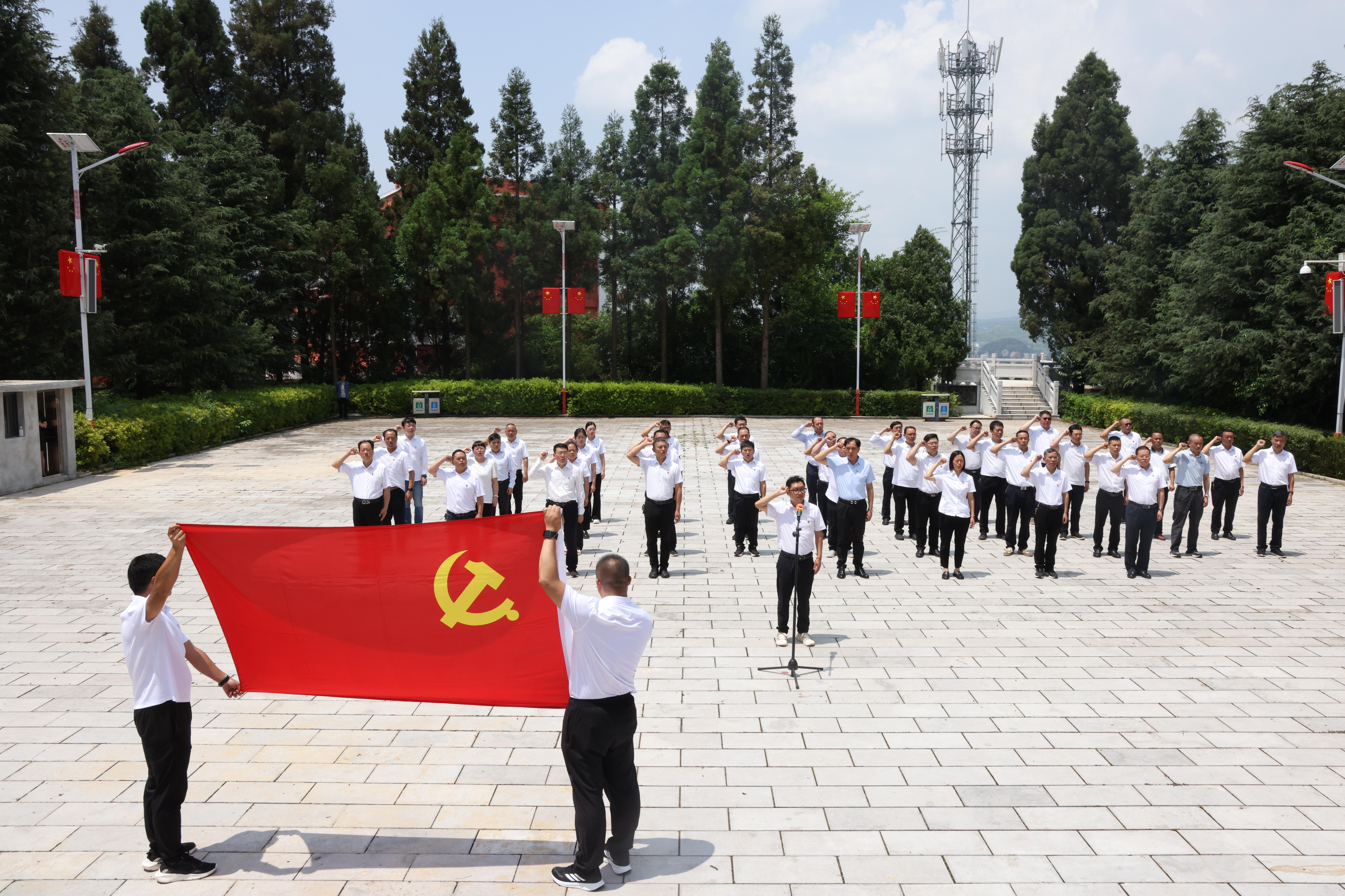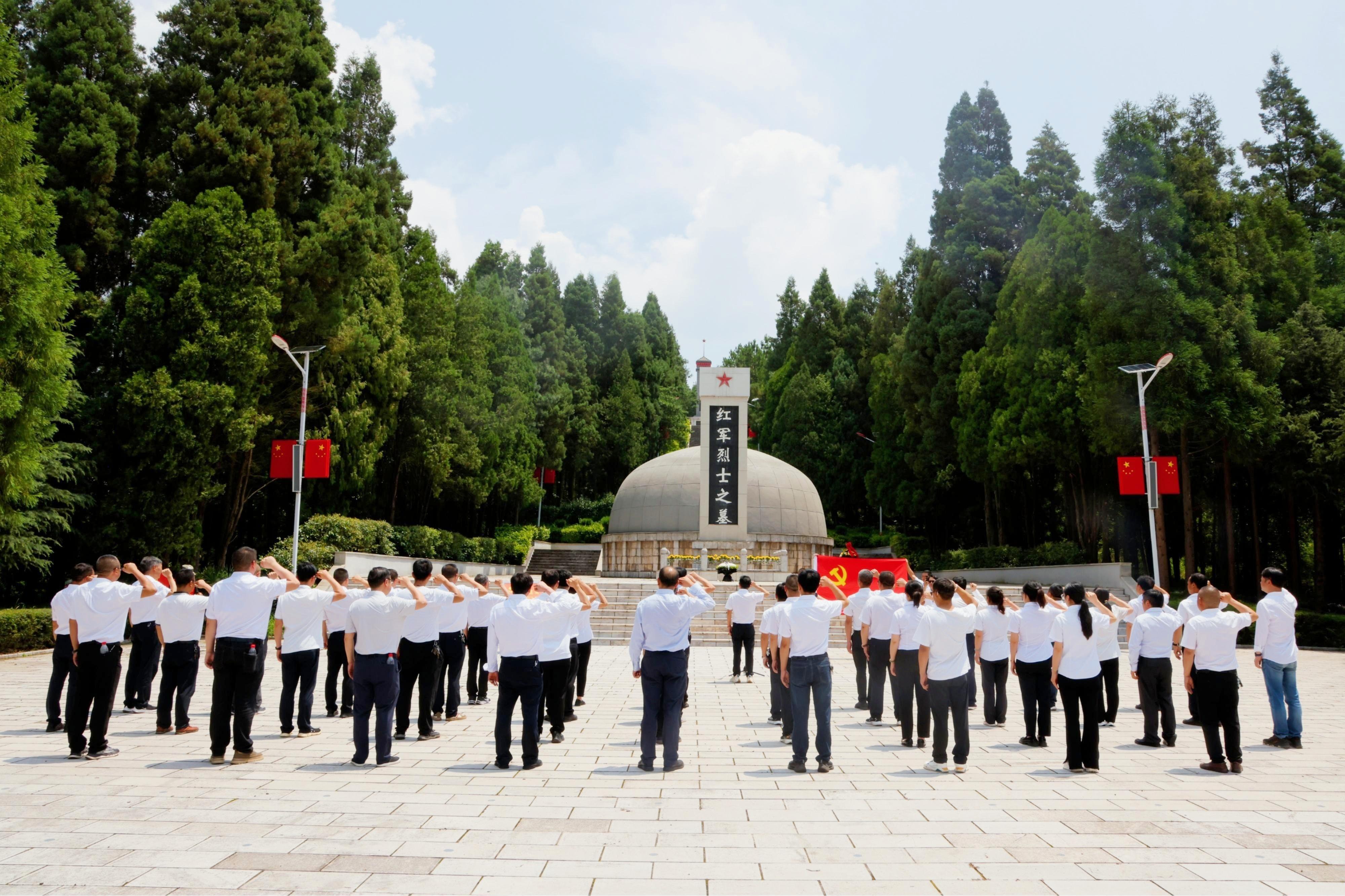随后,全体人员来到革命烈士纪念碑前。在庄严的氛围中,全体党员干部整齐列队、昂首肃立,奏唱《中华人民共和国国歌》,激昂的旋律在陵园上空回荡,唱出了对祖国的无限忠诚与对先烈的深切缅怀;国歌唱毕,全场静默肃立,向为民族解放事业英勇献身的革命烈士默哀致敬,以此表达对英烈的崇高敬意;默哀结束后,公司党委副书记、总经理曹喜金缓步上前,代表公司党委向烈士墓敬献鲜花,整理缎带;紧接着,在曹喜金同志的领誓下,全体党员干部举起右拳,面对鲜红的党旗重温入党誓词:"我志愿加入中国共产党,拥护党的纲领,遵守党的章程......"铿锵有力的誓言响彻陵园,既是对革命先烈的庄严承诺,更是赓续红色血脉、传承革命精神的坚定宣言。